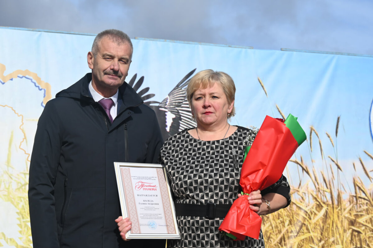 Кульминацией праздничных мероприятий стала церемония награждения лучших тружеников, передовиков уборочной кампании «Хвала и честь вам, хлеборобы!». Среди тех, кому пожал руку глава района за многолетний добросовестный труд, оператор машинного доения ОАО «Максимовичи-Агро» Наталья ПИНЧУК, агроном УКСП «Совхоз «ДОБРОВОЛЕЦ» Максим МИХАЛЁНОК, зоотехник-селекционер этого же сельхозпредприятия Наталья МЕДВЕДЕВА и ветврач Карина ШКУНОВА. Почётная грамота областного Совета депутатов за значительный вклад в развитие агропромышленного комплекса Могилёвщины вручена директору УКСП «Совхоз «Ольса» Игорю СКОРОХОДОВУ. Почётными грамотами Комитета по сельскому хозяйству и продовольствию Могилёвского облисполкома за высокий профессионализм, значительный вклад в развитие сельхозпроизводства награждены старший бухгалтер ОАО «Максимовичи-Агро» Галина КОЛЕДА, инженер-механик УКСП «Совхоз «Ольса», а во время жатвы – старший комбайнер передового экипажа комбайна Николай ЦЕЛИКОВ и тракторист-машинист этого же сельхозпредприятия Алексей ЗАИКИН. Весомый вклад в общий каравай района ежегодно вносят труженики УКСП «Совхоз «ДОБРОВОЛЕЦ». На счету крупнейшего сельхозпредприятия района 13 680 тонн зерна нового урожая. Хозяйство признано победителем районного соревнования за достижение высоких показателей на уборке урожая зерновых и зернобобовых растений.